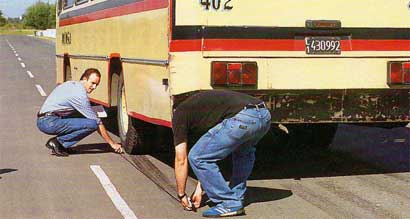 Para determinar con qué margen de seguridad puede contar un colectivero para casos de emergencia, resolvimos hacer una prueba con la amable colaboración de Mercedes-Benz Argentina, S. A., y de la línea 406, quienes nos prestaron un coche de la línea. Resolvimos usar un Mercedes-Benz porque es uno de los chasis más difundidos para el uso de transporte urbano, lo que valoriza la cualidad estadística de la prueba. Por supuesto, estaba equipado con frenos de aire.