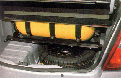 Está montado sobre una estructura de perfil de acero, la que se descubre recién cuando se retira la alfombra (enrollable) que oculta también a la rueda de auxilio. La carga de combustible se puede efectuar desde el mismo regulador, bajo el capot, o más cómodamente desde la toma junto a la boca del tanque de nafta, al abrir la tapa correspondiente.