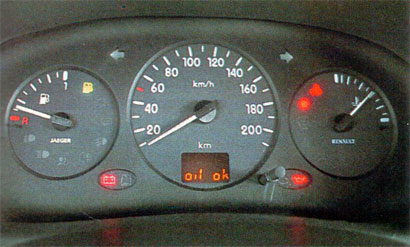 Tablero con nivel de nafta, velocímetro y termómetro. El odómetro tiene "check panel"